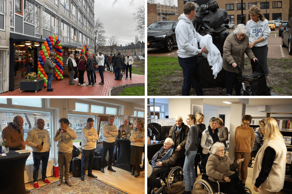 De Sierpleinbuurt maakte feestelijk kennis met De Open Hof Nieuw-West en ontmoetingsplek Casa Sofia. Het beeld Dikke vrinden is meegekomen uit Oost en staat te pronken in de voortuin. Heel fijn dat we nu ook aan de andere kant van de stad zorg en ondersteuning in het verpleeghuis en aan huis kunnen bieden.